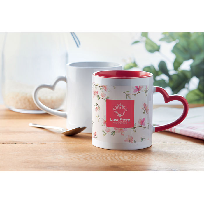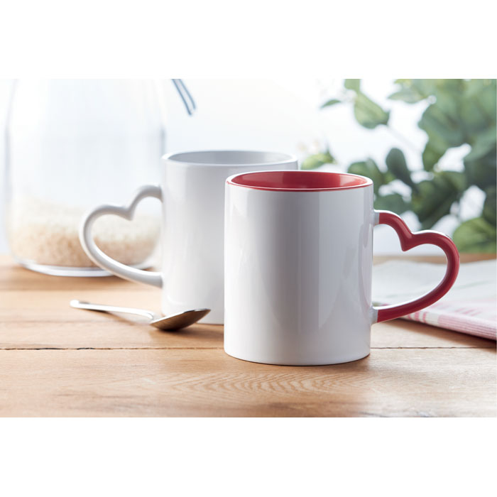 Caneca cerâmica com pega em forma de coração e interior colorido.
